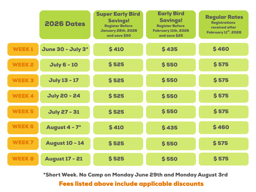 Registrations must be accompanied by a $200 deposit per child; the balance is required by June 1, 2026. After June 1, 2026, full payment is required upon registration unless alternate payment agreements have been made with the Camp Director. Payment options, including monthly payment options, are provided upon registration. If you require a customized payment plan, please contact the office and we will be more than happy to discuss options with you.